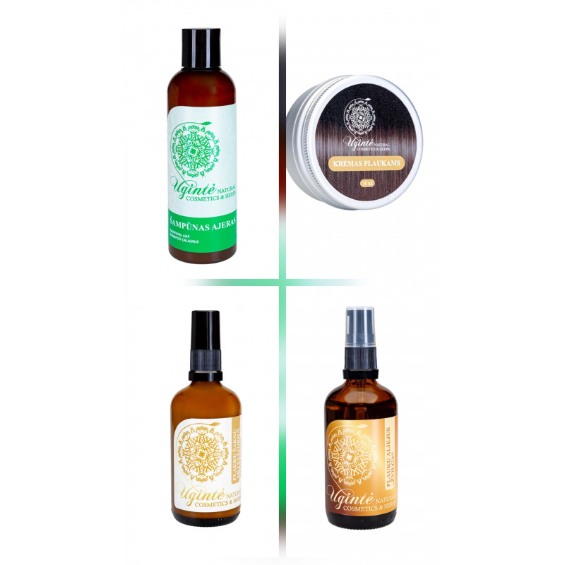 - Rinkinys plaukams: Šampūnas "Ajeras", Plaukų šaknų aktyvatorius, Kremas plaukų galiukams ir plaukams, Aliejų mišinys "Žvilga"